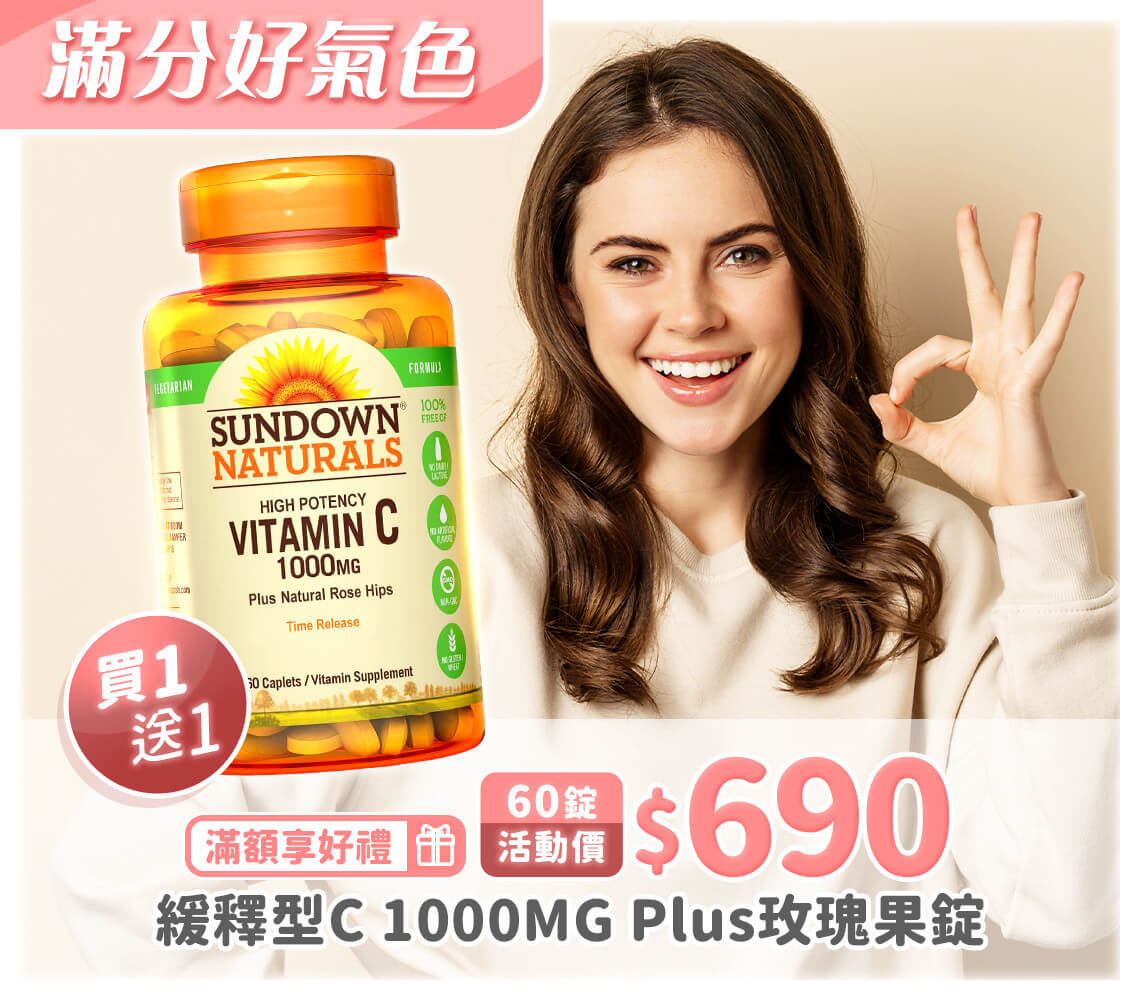 【即期品】Sundown日落恩賜 緩釋型C 1000MG Plus玫瑰果錠(60錠/瓶)_效期至2026/1/31