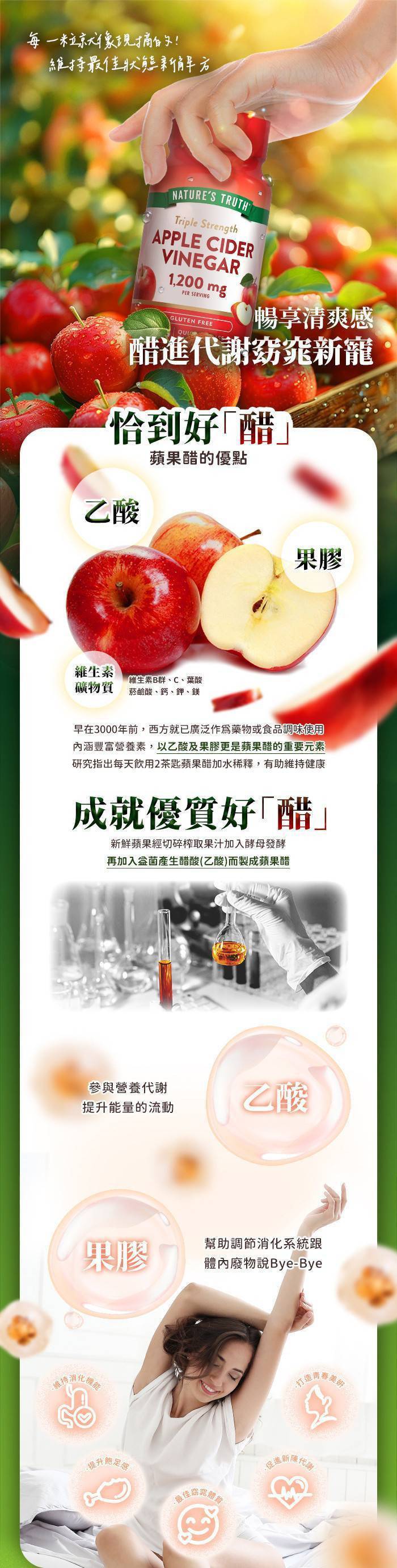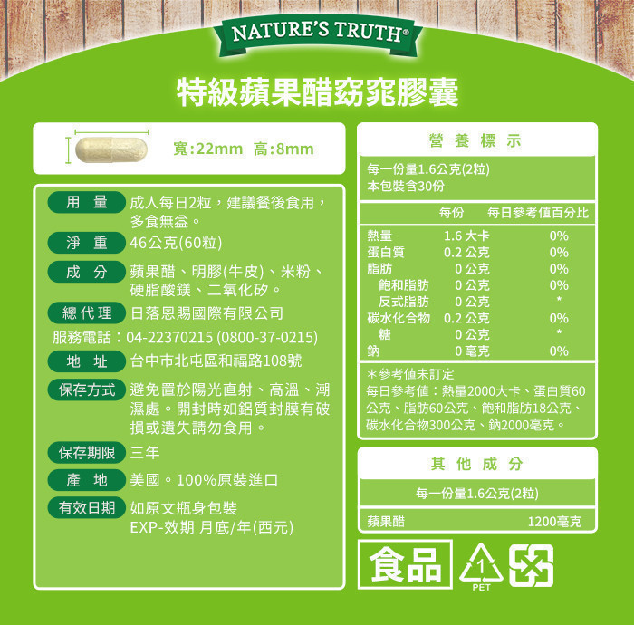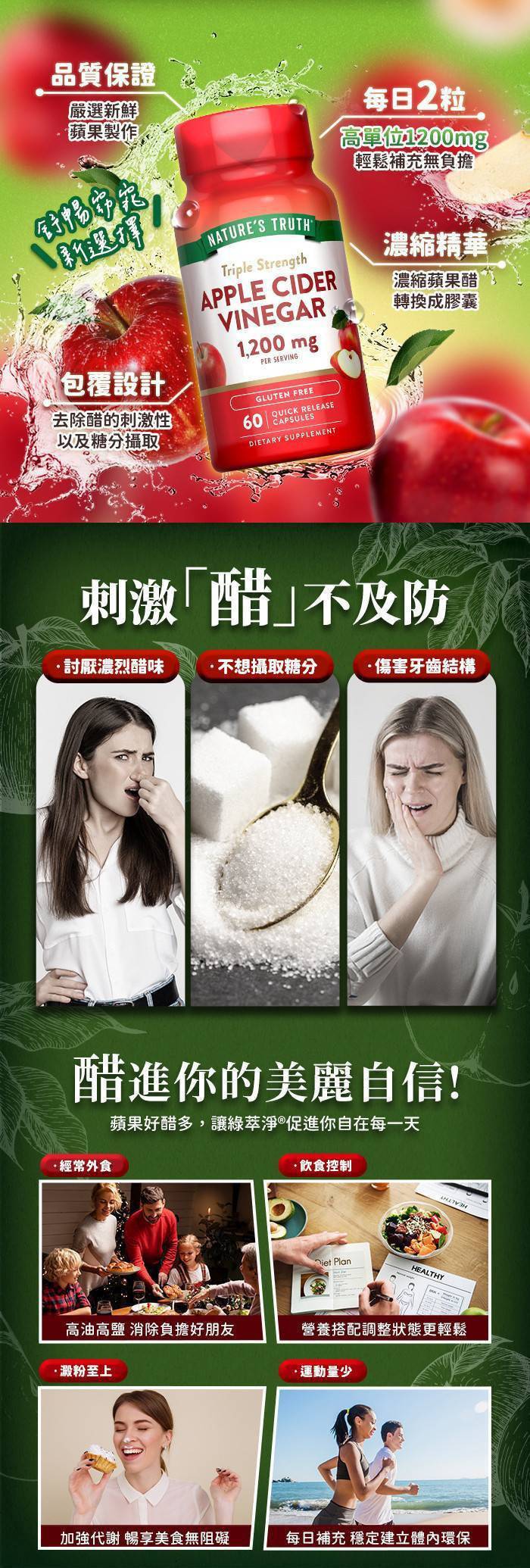 商品詳情 ★高單位蘋果醋1200mg ★幫助維持消化機能健康 ★膠囊型態免去醋酸困擾 ★輕鬆代謝、維持窈窕美麗 綠萃淨 特級蘋果醋窈窕膠囊x5瓶組(60粒/瓶) TWD $2,090 TWD$ 2,090