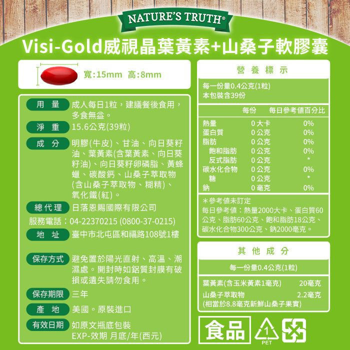 綠萃淨 Visi-Gold威視晶葉黃素+山桑子軟膠囊x3瓶組(39粒/瓶)