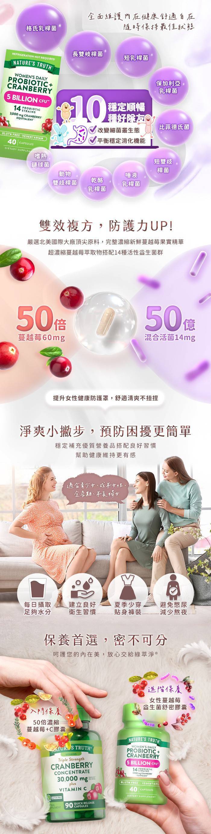 商品詳情 ★舒密雙效配方首選推薦 ★50倍濃縮北美蔓越莓 ★臨床試驗14種益生菌株 ★高達50億的活菌保護力 綠萃淨 女性蔓越莓益生菌舒密膠囊x3瓶組(40粒/瓶) TWD $1,690 TWD $1,690