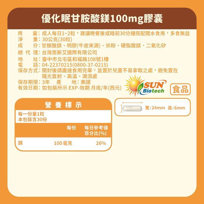 Sun日落恩賜 優化眠甘胺酸鎂100mg膠囊(30粒/袋)