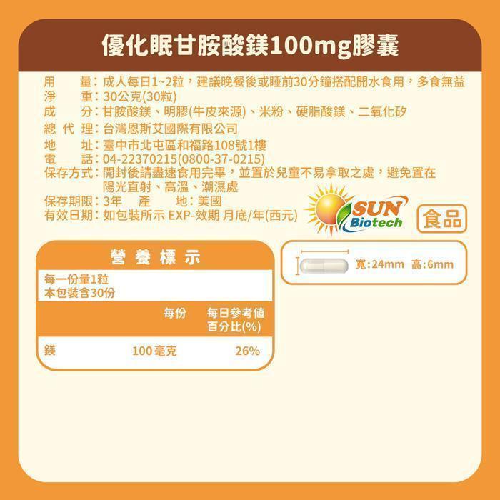 Sun日落恩賜 優化眠甘胺酸鎂100mg膠囊x3袋組(30粒/袋)